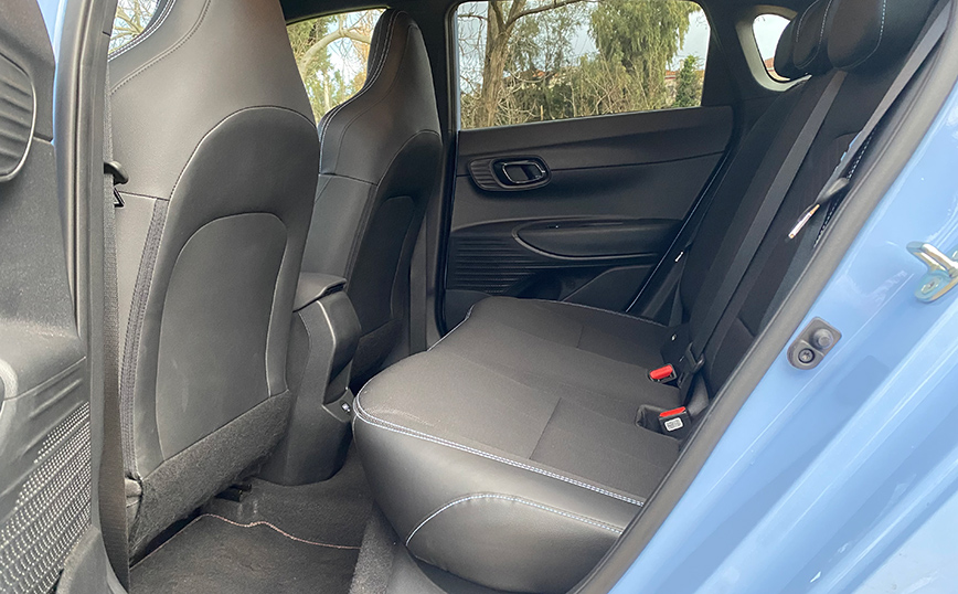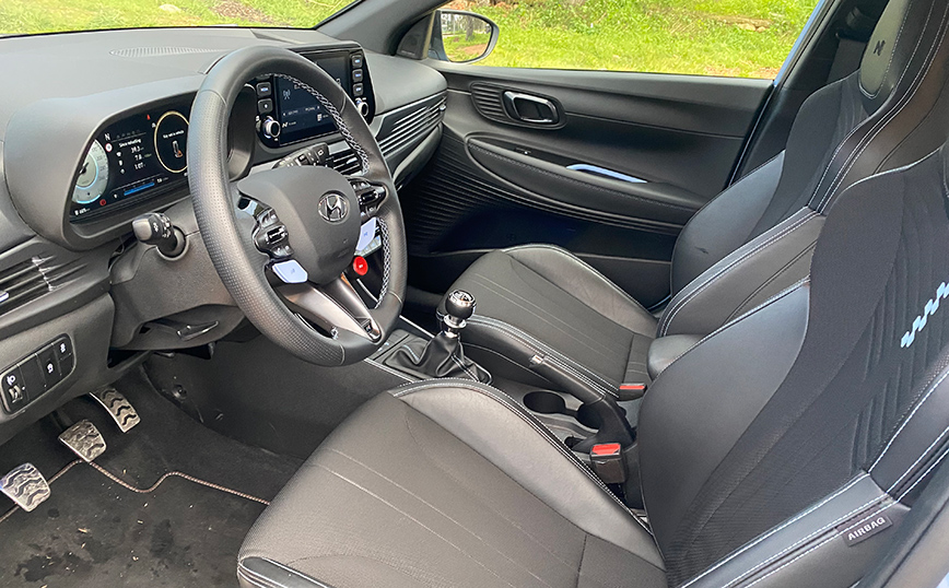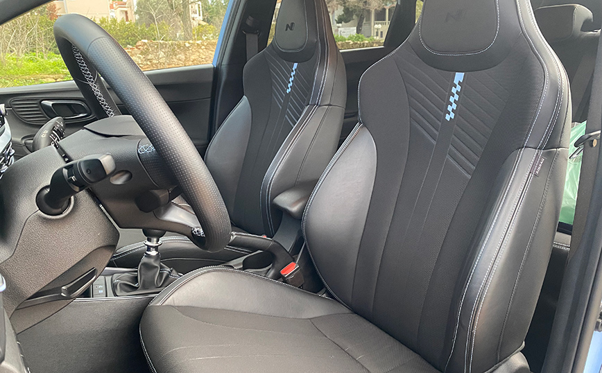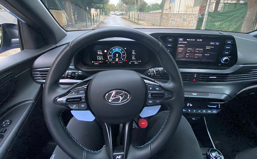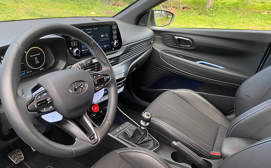 Το i20 N κερδίζει τον οδηγό από την πρώτη κιόλας επαφή. Κάθεσαι χαμηλά, με κάθισμα που προσφέρει έντονη πλευρική στήριξη και σου δίνει την αίσθηση ότι, γίνεσαι ένα με το αυτοκίνητο. Η μέτρια διάμετρος του πολυρυθμιζόμενου – πολυλειτουργικού τιμονιού με το σωστό πάχος της στεφάνης, αποδεικνύουν την οδηγοκεντρική σχεδίαση του εσωτερικού σε συνδυασμό με το «πόμολο» του μοχλού ταχυτήτων που κάνει υποδειγματικό «κούμπωμα» με μικρές – σαφείς διαδρομές.