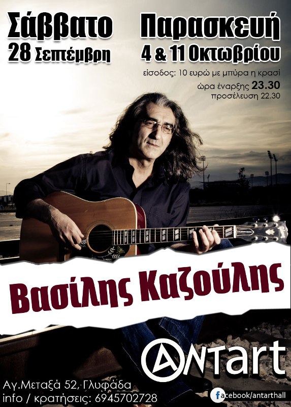 Ο Βασίλης Καζούλης εμφανίζεται ζωντανά την Παρασκευή 4 και 11 Οκτωβρίου στο ΑΝΤart στη Γλυφάδα και το newsbeast.gr εξασφάλισε διπλές προσκλήσεις για 10 τυχερούς αναγνώστες.