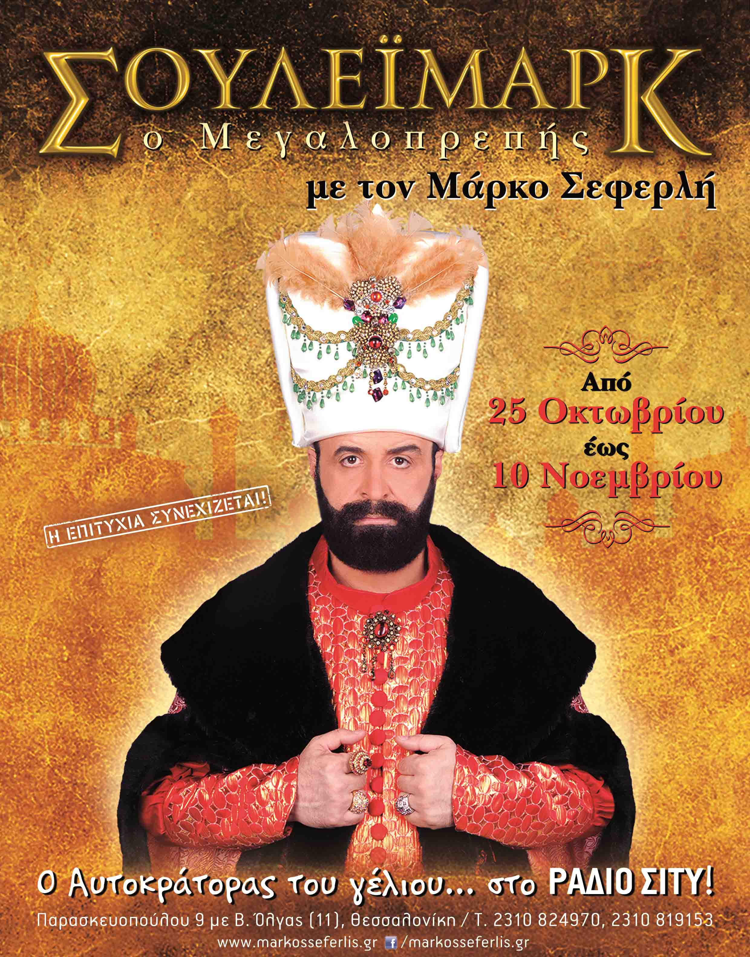 Ακούσατε! Ακούσατε! Άγγλοι, Γάλλοι, Πορτογάλοι, Έλληνες κι Οθωμανοί! Ο ένας, ο μοναδικός, ο ανεπανάληπτος, ο πολυχρονεμένος μας «Σουλεϊμάρκ ο Μεγαλοπρεπής» – κατά κόσμον Μάρκος Σεφερλής – έρχεται σε λίγες μέρες στη Θεσσαλονίκη!