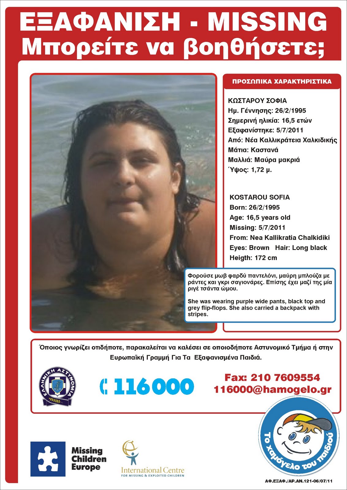 Η 16χρονη Κώσταρου Σοφία εξαφανίστηκε από το σπίτι της στη Νέα Καλλικράτεια Χαλκιδικής στις 5 Ιουλίου.