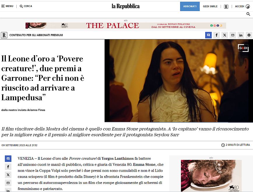 H ιταλική εφημερίδα La Repubblica αναφέρεται με άκρως επαινετικό σχόλιο στην βράβευση της ταινίας Poor Things του Γιώργου Λάνθιμου με το Χρυσό Λέοντα της Μπιενάλε Βενετίας.