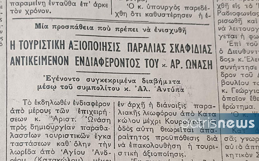 Μάλιστα, ο Ηλείος Αλ. Αντύπας, μιλώντας με τον διευθυντή των επιχειρήσεων Ωνάση κ. Πατρονικόλα, μετέφερε στην εφημερίδα πως για τον επιχειρηματία, απαραίτητη προϋπόθεση για να προχωρήσει στην έναρξη των εργασιών ήταν η διάνοιξη παραλιακής λεωφόρου, που θα ξεκινούσε από το Κατάκολο και θα έφτανε μέχρι την Κουρούτα.