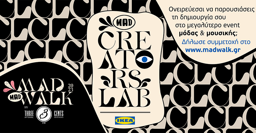 Τo ΜAD και η IKEA, εταιρεία του Ομίλου FOURLIS, με σύνθημα «Μαζί δημιουργούμε νέες δυνατότητες», καλούν νέους δημιουργούς μόδας να παρουσιάσουν τη δουλειά τους στο μεγαλύτερο event μόδας και μουσικής στην Ελλάδα, το MadWalk 2023 by Three Cents.