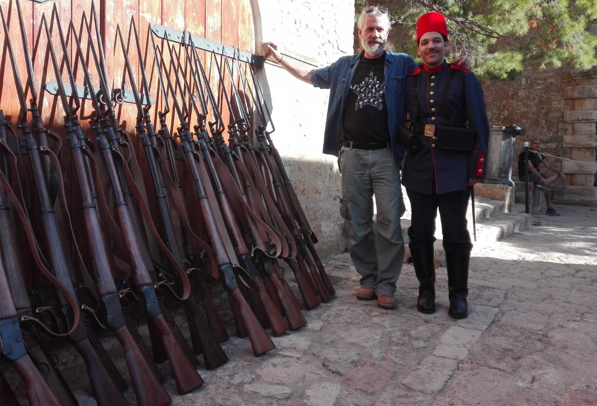 «Κατασκεύασα 60 αντίγραφα τουφεκίων τύπου Peabody Martini με τις ξιφολόγχες τους. 20 σπαθιά (γιαταγάνια), 20 κρητικά μαχαίρια, 20 φυσιγγιοθήκες και 1.000 φυσίγγια. Επίσης, προμήθευσα την παραγωγή με πάνω από 20 αυθεντικά τουφέκια, από καρυοφίλια και άλλα εμπροσθογεμή του 19ου αιώνα μέχρι γαλλικά τουφέκια τύπου Gras 1874, εμπροσθογεμείς και οπισθογεμείς πιστόλες, αυθεντικά γιαταγάνια και μαχαίρια. Μέχρι και ρόπαλο από ρίζα αγριελιάς, την περίφημη “χουρχούδα”».