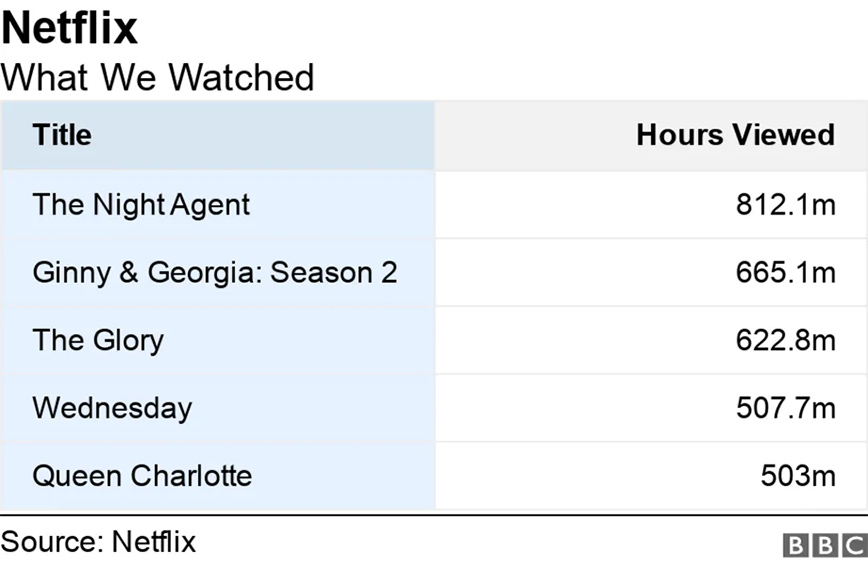 Καλύπτοντας σχεδόν 100 δισεκατομμύρια ώρες τηλεθέασης, άλλες εκπομπές που εμφανίστηκαν σε περίοπτη θέση στη λίστα ήταν οι Ginny and Georgia, Gilmore Girls, Seinfeld, Friends και The Office.