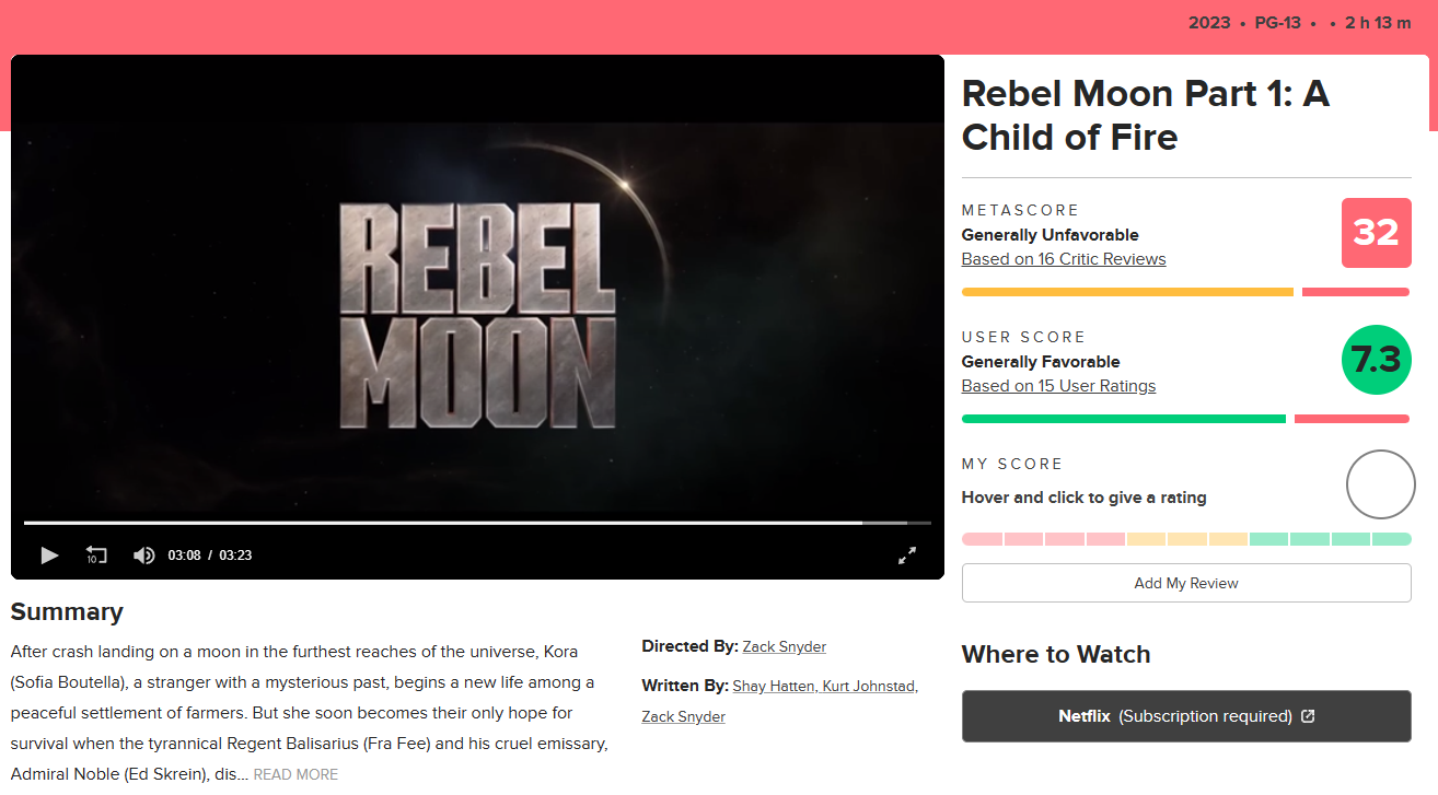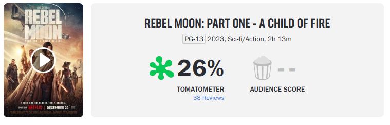 Μπορεί το Netflix να ποντάρει πολλά στο Rebel Moon, όμως τα πρώτα στοιχεία δεν είναι ενθαρρυντικά, καθώς τα πρώτο reviews μετά την περιορισμένη πρεμιέρα του στις ΗΠΑ το τοποθετούν στις χειρότερες ταινίες του 2023. Μάλιστα, στην πρώτη φάση η βαθμολογία του στο Rotten Tomatoes ήταν 9/100.
