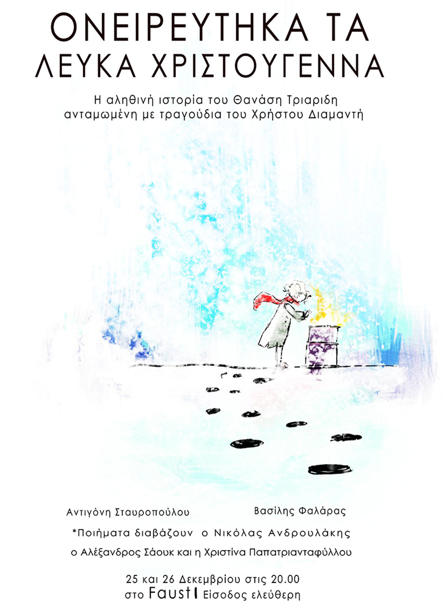 Για δύο βραδιές, στις 25 και 26 Δεκεμβρίου, 25 και 26 Δεκεμβρίου, στις 20.00, στο Faust θα παρουσιαστεί με ελεύθερη είσοδο, η παράσταση «Ονειρεύτηκα τα λευκά Χριστούγεννα». Πρόκειται για την αληθινή ιστορία του Θανάση Τριαρίδη ανταμωμένη με τραγούδια του Χρήστου Διαμαντή.