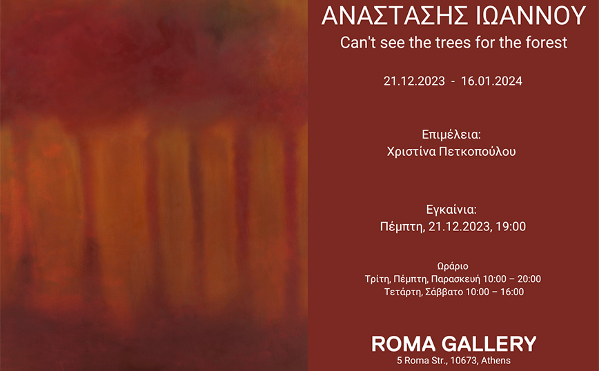 Ο Αναστάσης Ιωάννου παρουσιάζει την πρώτη ατομική έκθεσή του στη Roma Gallery από την Πέμπτη 21 Δεκεμβρίου 2023, με τίτλο «Can’t See the Trees for the Forest». Σε αυτήν o ζωγράφος παρουσιάζει μια νέα ενότητα έργων, που επαναπροσδιορίζουν και επανανοηματοδοτούν το θέμα που τον απασχολεί, ενώ ο ίδιος επιστρέφει με πίστη σε αυτό, για να αποκαλύψει τις αμέτρητες διαστάσεις του.