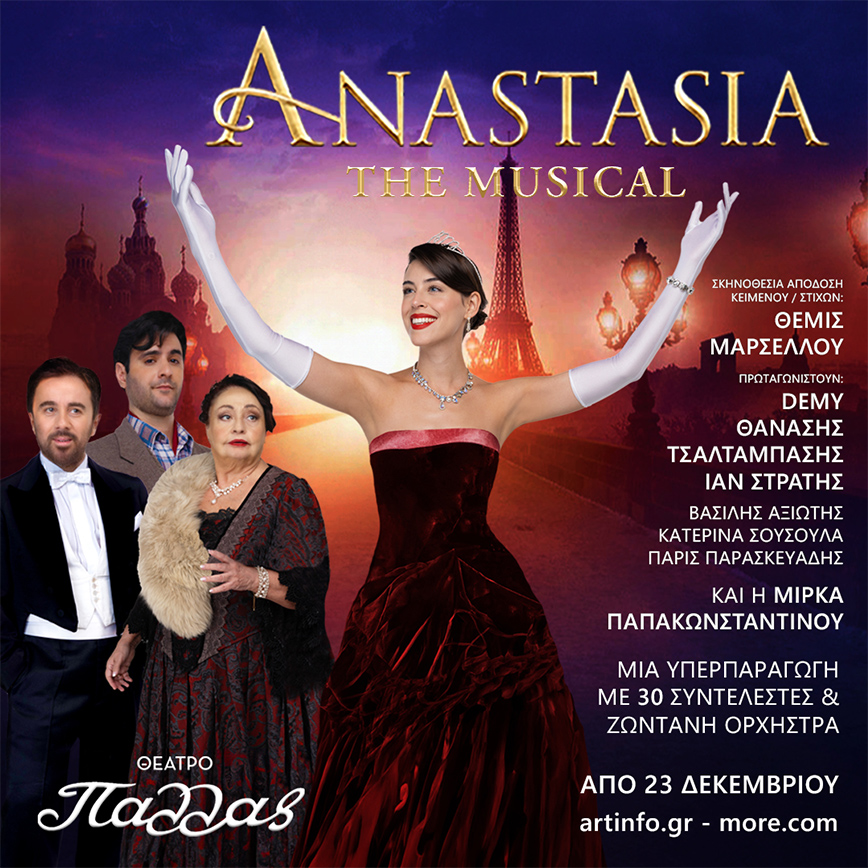 «Anastasia the musical» τιτλοφορείται η συγκλονιστική ιστορία της πριγκίπισσας Αναστασίας, βασισμένη στην αγαπημένη ταινία κινουμένων σχεδίων του 1997, που έρχεται αυτά τα Χριστούγεννα στη σκηνή του Παλλάς! Ένας πολυμελής θίασος ηθοποιών, χορευτών και τραγουδιστών, εντυπωσιακά σκηνικά και εκθαμβωτικά κοστούμια αποτελούν μία υπερπαραγωγή που δεν πρέπει να χάσει κανείς!