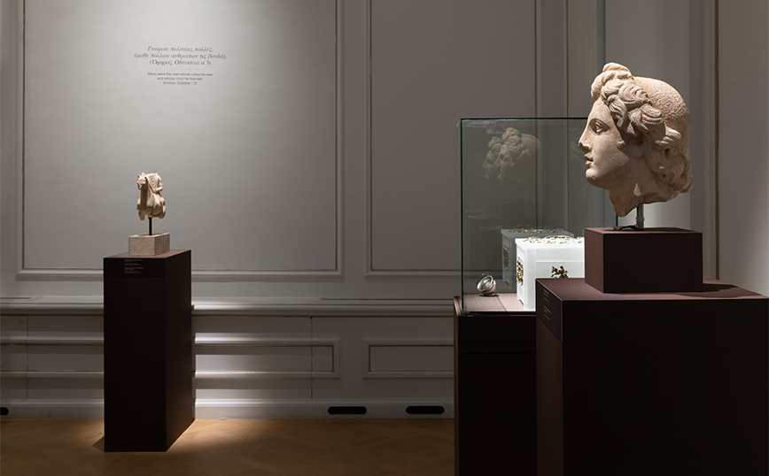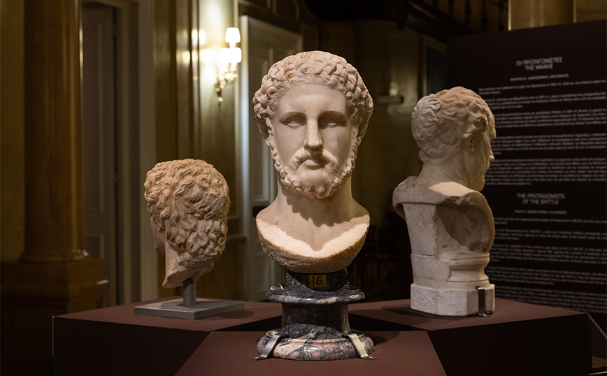 Η έκθεση περιλαμβάνει 240 αρχαιότητες και ιστορικά τεκμήρια προερχόμενα από 27 Μουσεία και Ιδρύματα του εσωτερικού και τέσσερεις ιδιωτικές συλλογές, πολλά εκ των οποίων εκτίθενται για πρώτη φορά. Παρουσιάζονται επίσης δύο μαρμάρινες προτομές από το Μουσείο Chiaramonti του Βατικανού ενώ μεγάλος «Απρόσμενος Επισκέπτης» είναι το έργο «Μέγας Αλέξανδρος» (1981) του Andy Warhol από το MOMus – Μουσείο Σύγχρονης Τέχνης.