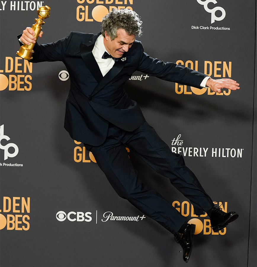 Στη φωτογράφιση που γίνεται μετά την τελετή απονομής με τους νικητές των βραβείων και τα καστ των ταινιών που ξεχώρισαν, ο Μαρκ Ράφαλο κρατάει τη Χρυσή Σφαίρα στο χέρι και κυριολεκτικά χοροπηδάει από τη χαρά του.