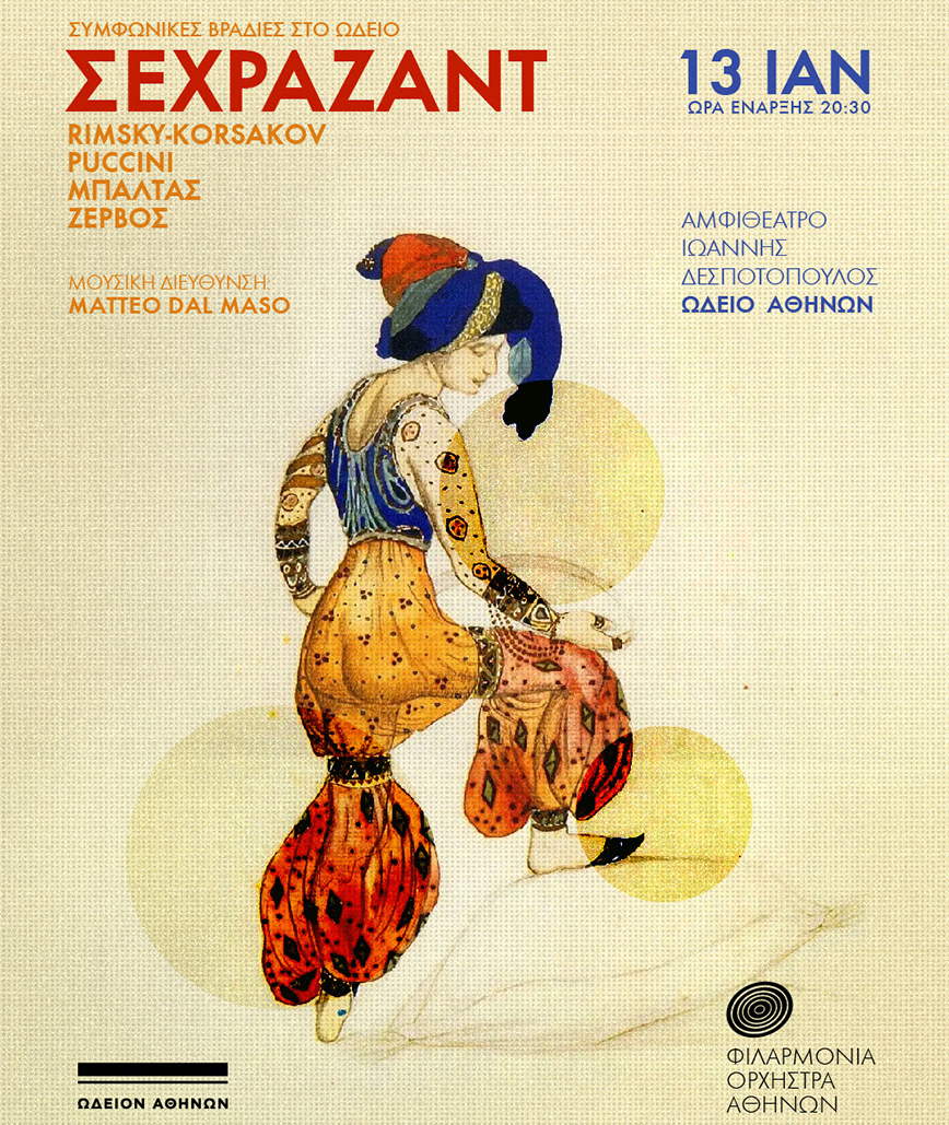 Η αυλαία των Συμφωνικών βραδιών της Φιλαρμόνιας Ορχήστρας Αθηνών στο Ωδείο Αθηνών για το 2024 ανοίγει στις 13 Ιανουαρίου, με μια πολυαναμενόμενη συναυλία, ο τίτλος της οποίας αναφέρεται σε ένα έργο-ογκόλιθο για το συμφωνικό ρεπερτόριο: Σεχραζάντ, του Νικολάι Ρίμσκι-Κόρσακοφ.