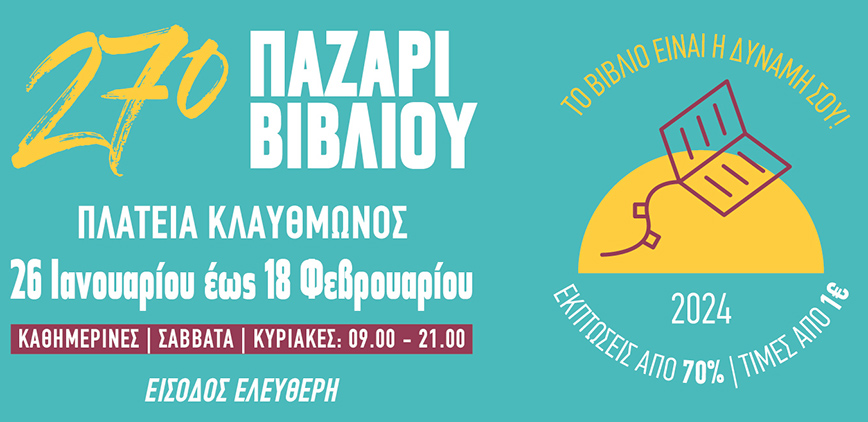 Το 27ο Παζάρι Βιβλίου 2024, θα λειτουργεί καθημερινές, Σάββατα και Κυριακές από τις 09:00 το πρωί έως και τις 21:00 το βράδυ, μέχρι και τις 18 Φεβρουαρίου.