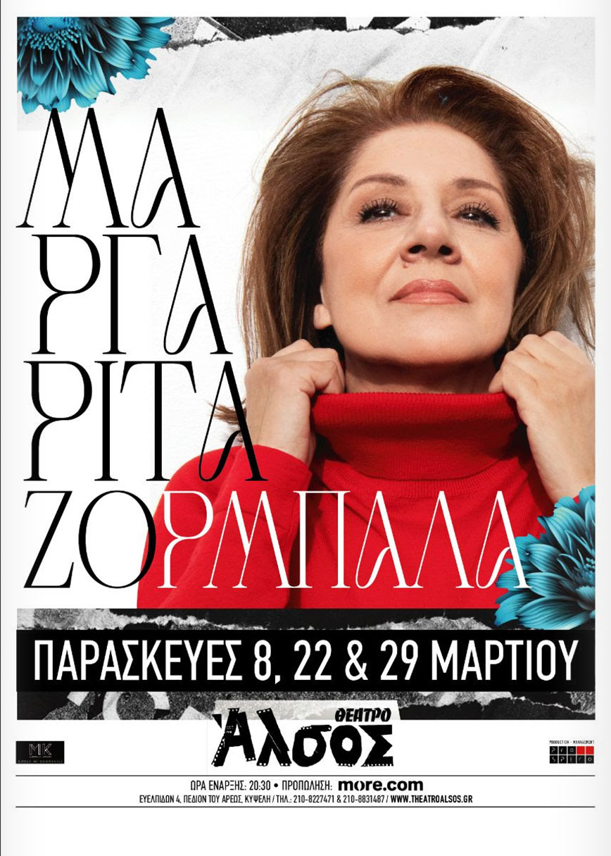 Με σπουδαία διαδρομή, κορυφαίες συνεργασίες και πολύ χαρακτηριστικό στίγμα στο ελληνικό τραγούδι, η Μαργαρίτα Ζορμπαλά ανακαλεί φέτος στο Άλσος δικές της αξεπέραστες ερμηνείες από τις συναντήσεις της με κορυφαίους συνθέτες και ποιητές, όπως το Μίκη Θεοδωράκη, το Μάνο Χατζιδάκι, το Νίκο Γκάτσο, το Μανώλη Αναγνωστάκη κ.α., αλλά επίσης δοκιμάζει για πρώτη φορά τραγούδια που την συγκινούν, την γοητεύουν και της ανοίγουν νέους δρόμους.
