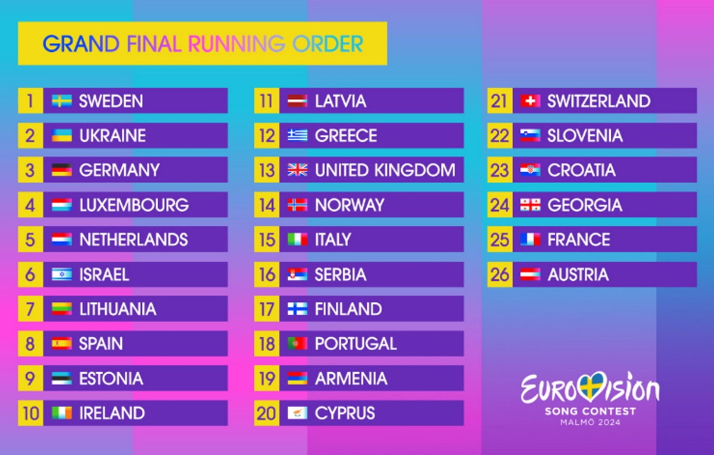 Σημειώνεται πως οι υπόλοιπες χώρες που θα βρεθούν μαζί με τη χώρα μας στον τελικό της Eurovision το Σάββατο 11 Μαΐου είναι η Λετονία, η Αυστρία, η Ολλανδία, η Νορβηγία, το Ισραήλ, η Εσθονία, η Ελβετία, η Γεωργία και η Αρμενία.