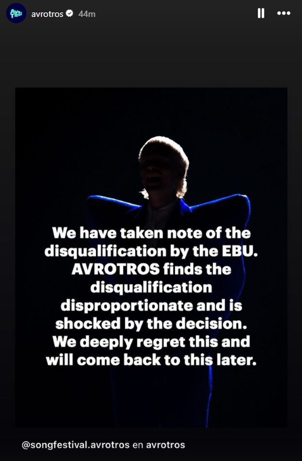 Η πρώτη αντίδραση στον αποκλεισμό του Joost Klein από τον τελικό της Eurovision, ήρθε σύμφωνα με το Γαλλικό Πρακτορείο Ειδήσεων από τον τηλεοπτικό σταθμό Avrotros, που φιλοξενεί τον διαγωνισμό στην Ολλανδία, καθώς θεωρεί τον αποκλεισμό του Ολλανδού καλλιτέχνη «δυσανάλογο».