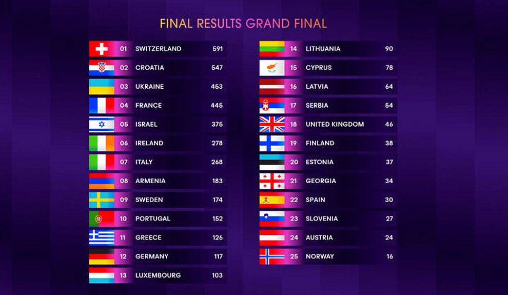 Δεύτερη βγήκε η Κροατία και τρίτη η Ουκρανία. Η Ελλάδα με τη Μαρίνα Σάττι κατέκτησε την 11η θέση, ενώ η Κύπρος τη 15η θέση.
