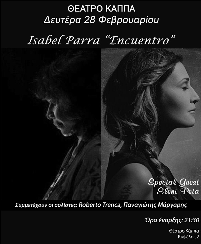 Η Χιλιάνη Ιζαμπέλ Πάρρα, γνήσια εκπρόσωπος μιας ιδιαίτερης κουλτούρας, που αγκαλιάζει με την αισθαντική φωνή της την πολυμορφία της Λατινικής Αμερικής και ο κιθαριστής Ρομπέρτο Τρένκα, συναντoύν το Duende της Ελένης Πέτα και του Παναγιώτη Μάργαρη στη σκηνή του Θεάτρου Κάππα.