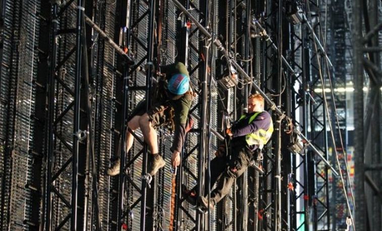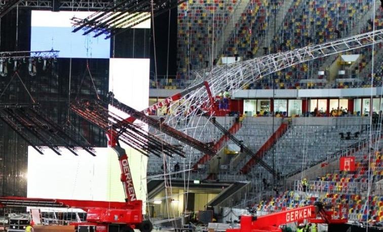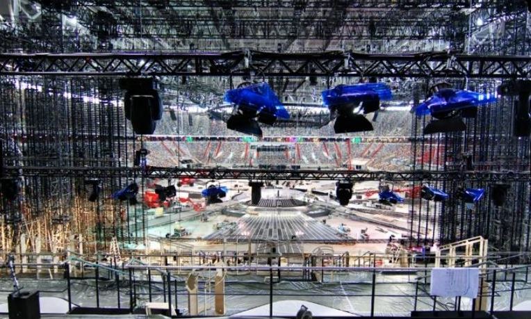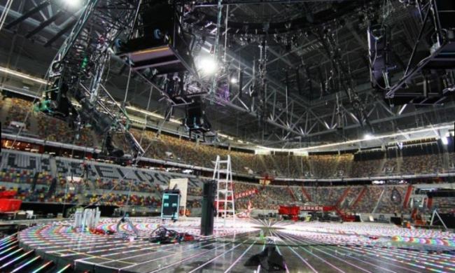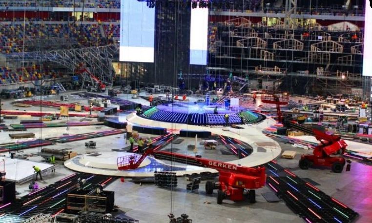 Οι φωτογραφίες από τη σκηνή είναι εντυπωσιακές! Υπάρχει ένας τεράστιος «τοίχος» ύψους 18 μέτρων και πλάτους 60, όπου έχουν τοποθετηθεί 520 φωτιστικά σώματα ενώ υπάρχουν επίσης, οθόνες led και μεταλλικές κατασκευές περιμετρικά της σκηνής και πίσω από αυτήν.