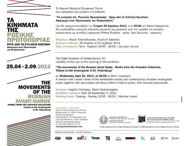 Στην έκθεση γίνεται επίσης μια ευρύτερη παρουσίαση έργων που δημιουργήθηκαν από καλλιτέχνες της ρωσικής πρωτοπορίας που γεννήθηκαν ή εργάσθηκαν στην Πετρούπολη / Λένινγκραντ κατά το διάστημα από το 1905 ως το 1935, καθώς αποτελεί συμμετοχή στο πρόγραμμα εκδηλώσεων του Δήμου Θεσσαλονίκης για τη 10η επέτειο αδελφοποίησης μεταξύ Θεσσαλονίκης και Αγίας Πετρούπολης και ειδικότερα αφορμή την έκθεση «Οι Ζωγράφοι της Αγίας Πετρούπολης 1920-2010» από τη Συλλογή της Πινακοθήκης Manege της Αγίας Πετρούπολης που διοργανώνει η Αντιδημαρχία Πολιτισμού και Τουρισμού και η Δημοτική Πινακοθήκη Θεσσαλονίκης (Casa Bianca, Βασ. Όλγας 180, 26.04-30.06.2012)