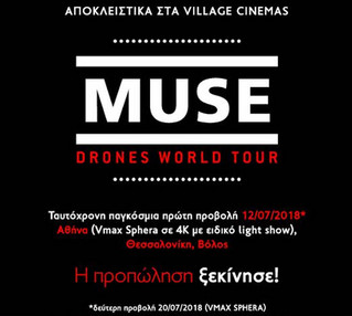 Μία μοναδική συναυλιακή εμπειρία στην καλύτερη ποιότητα εικόνας και ήχου, από το μεγαλύτερο ροκ συγκρότημα των τελευταίων ετών. Οι Muse, έρχονται αποκλειστικά στα Village Cinemas, στο πλαίσιο της φουτουριστικής περιοδείας τους, «Drones World Tour», που διήρκεσε ένα χρόνο, συμπληρώνοντας 130 live εμφανίσεις. Κλασικά κομμάτια των Muse, όπως το «Psycho», «Madness», «Uprising», «Plug In Baby», «Supermassive Black Hole» και «Knights Of Cydonia», θα είναι μερικά από αυτά που θα ακουστούν κατά τη διάρκεια της προβολής. Ένα ντοκιμαντέρ της ροκ μουσικής, στις οθόνες των Village Cinemas.