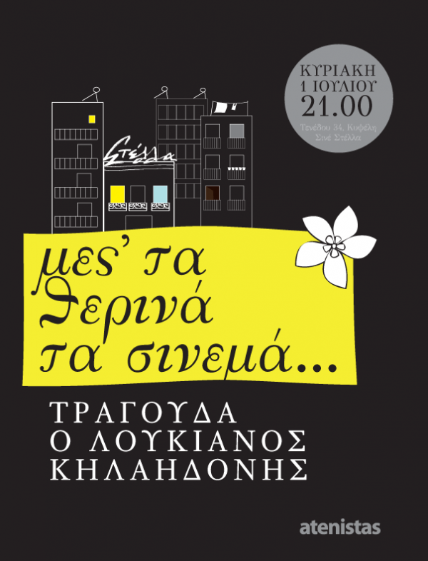 Το ραντεβού δίνεται την Κυριακή 1η Ιουλίου, στο «Σινέ Στέλλα», που ανοίγει μετά από 4 χρόνια σιωπής, για σινεμά (προβολή αρχικά της ταινίας «Η Αθήνα τη νύχτα» 60′), αθηναϊκές μουσικές των 60s/70s στα μεγάφωνα, ενημερωτικό υλικό για την ιστορία των θερινών στην πόλη και φυσικά τραγούδια μαζί με τον Λουκιανό Κηλαηδόνη.