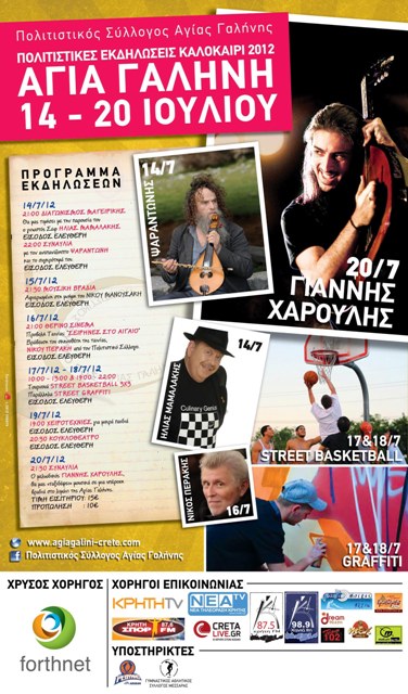 O Πολιτιστικός σύλλογος Αγ. Γαλήνης, από 14 έως 20 Ιουλίου 2012, έχει ετοιμάσει ένα μοναδικό πολιτιστικό πρόγραμμα για όλες τις ηλικίες, τιμώντας την κρητική παράδοση – μουσική – κουζίνα.