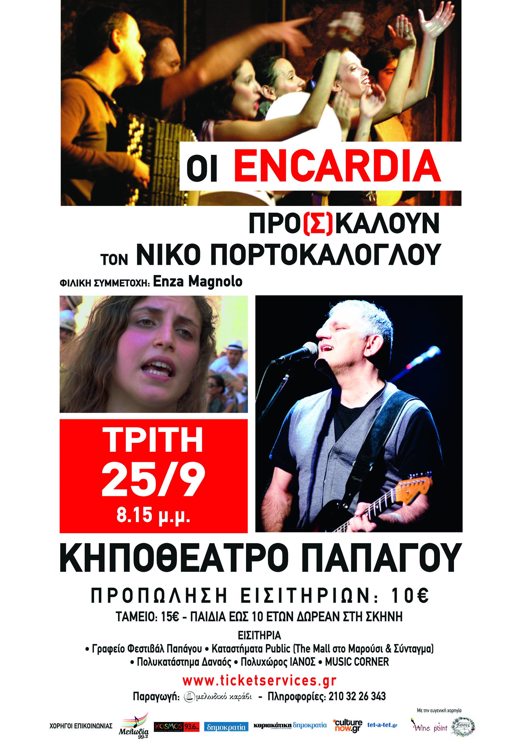 Σήμερα, οκτώ χρόνια μετά την πρώτη τους συνεργασία, οι encardia βρίσκονται και πάλι επί σκηνής με τον Νίκο Πορτοκάλογλου και του απευθύνουν δημόσια ένα μεγάλο ευχαριστώ για εκείνη την πολύτιμη συμπαράσταση στην «απόλυτη» αρχή τους. Η συναυλία θα είναι αφιερωμένη στον βετεράνο μουσικό Giovanni Aνantaggiato, που η σχέση του με τους encardia έχει σταθεί πολύτιμο σημείο αναφοράς και έμπνευσης για την πορεία του συγκροτήματος. Καλεσμένη απο την πεδιάδα του Σαλέντο αυτή τη φορά η εκπληκτική μουσικός Enza Magnolo, που η φωνή της έχει όλα τα χρώματα και την έκρηξη της Κατωιταλικής γής.