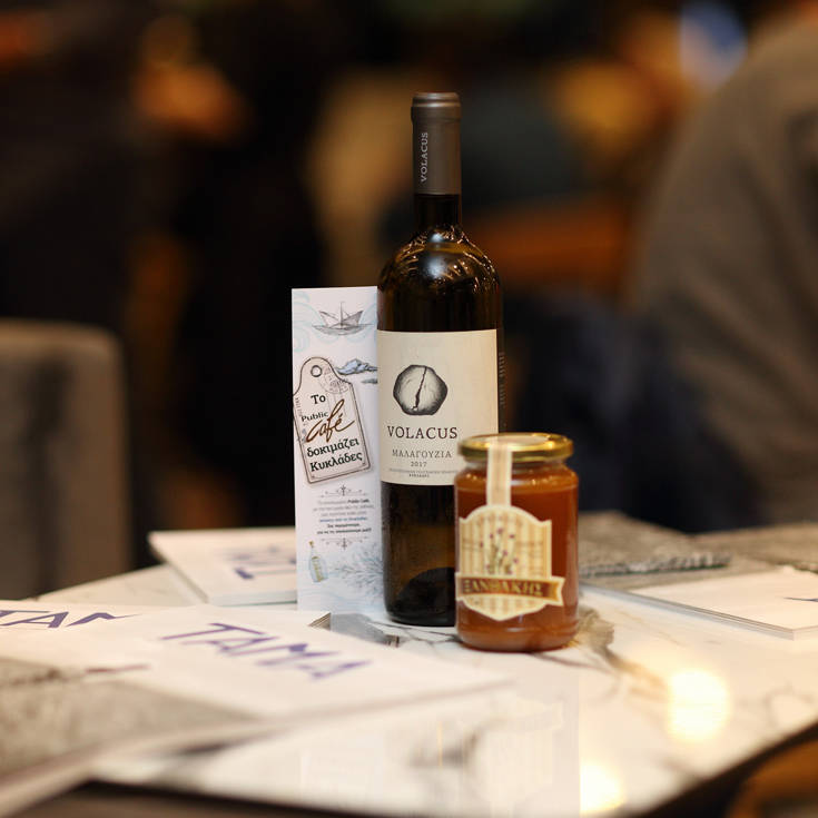 Κατά την εκδήλωση για τη παρουσίαση της ενέργειας, στο Public Café έφτασαν από την Τήνο εκλεκτά προϊόντα με τους παραγωγούς τους, οι οποίοι μίλησαν για αυτά, εκφράζοντας τη μοναδικότητα της γεύσης και της δημιουργίας τους.