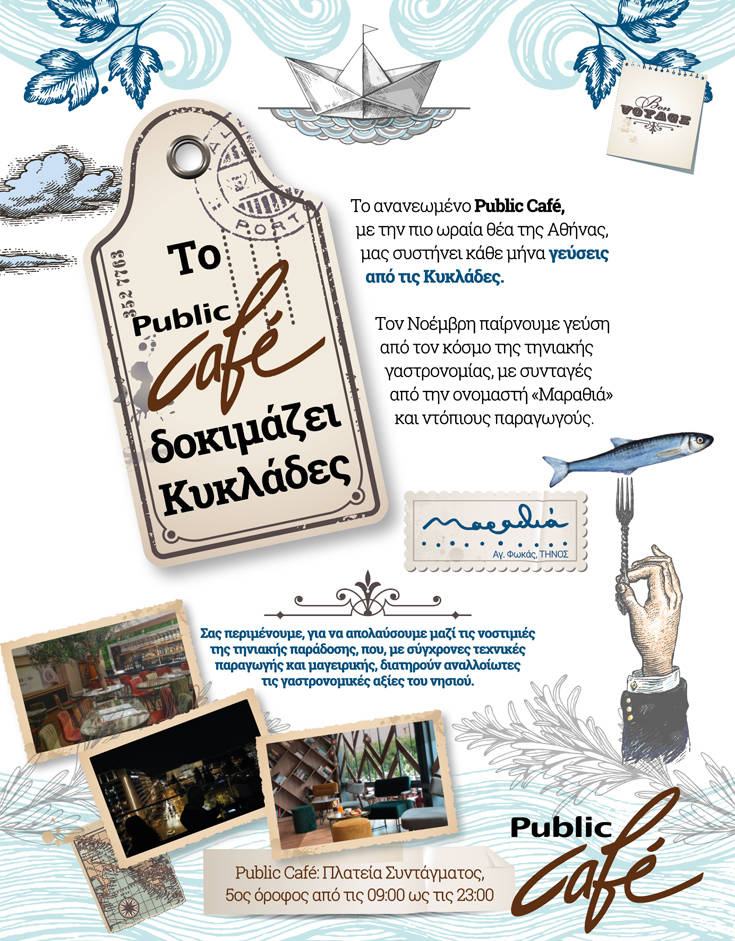 Στο ήδη πλούσιο μενού του Public Café προστέθηκαν πιάτα ημέρας με έμπνευση από το αγαπημένο νησί των Κυκλάδων, που τα τελευταία χρόνια, χάρη και στο φεστιβάλ Tinos Food Paths, προβάλλει οργανωμένα μεν αλλά με απόλυτο σεβασμό στην παράδοση τον γαστρονομικό του πλούτο.