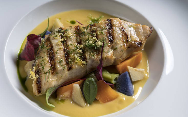 Για κυρίως δοκιμάσαμε ένα έξοχα ψημένο λαβράκι σχάρας, που συνοδευόταν ιδανικά με πουρέ κουνουπιδιού, χειμωνιάτικα λαχανικά και μια vinaigrette μοσχολέμονο με κύμινο. Ο γευστικός επίλογος γράφτηκε με έναν ιδιαίτερο χαλβά με φρούτα του δάσους, crumble από λευκή σοκολάτα, σορμπέ από μύρτιλα, lime και βασιλικό.