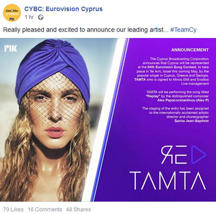 «Το Ραδιοφωνικό Ίδρυμα Κύπρου ανακοινώνει ότι η Κύπρος θα εκπροσωπηθεί στον 64ο διαγωνισμό τραγουδιού της Eurovision που θα πραγματοποιηθεί στο Τελ Αβίβ του Ισραήλ τον προσεχή Μάιο, από την δημοφιλή τραγουδίστρια σε Κύπρο, Ελλάδα και Γεωργία, ΤΑΜΤΑ που εκπροσωπείται δισκογραφικά από την Minos EMI και την εταιρία management Ερωδιός Live. H ΤAMTA θα ερμηνεύσει το τραγούδι του διακεκριμένου συνθέτη Άλεξ Παπακωνσταντίνου (Alex P) με τίτλο «Replay». Η επιμέλεια της παρουσίασης του τραγουδιού επί σκηνής έχει ανατεθεί στην διεθνώς καταξιωμένη καλλιτεχνική διευθύντρια και χορογράφο Sacha Jean-Baptiste» ανέφερε η ανακοίνωση του ΡΙΚ, που ανέβηκε στα social media.
