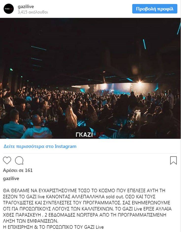 «ΘA ΘEΛAME NA EYXAPIΣTHΣOYME TOΣO TOΝ KOΣMO ΠOY EΠEΛEΞE AYTH TH ΣEZON TO GAZI Live KANONTAΣ AΛΛEΠAΛΛHΛA sold out, OΣO KAI TOYΣ TPAΓOYΔIΣTEΣ KAI ΣYNTEΛEΣTEΣ TOY ΠPOΓPAMMATOΣ. ΣAΣ ENHMEPΩNOYME OTI ΓIA ΠPOΣΩΠIKOYΣ ΛOΓOYΣ TΩN KAΛΛITEXNΩN, TO GAZI Live EPIΞE AYΛAIA XΘEΣ ΠAPAΣKEYH, 2 EBΔOMAΔEΣ NΩPITEPA AΠO THΝ ΠPOΓPAMMATIΣMENH ΛHΞH TΩN EMΦANIΣEΩN.
