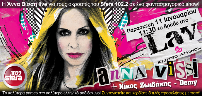 Η Άννα Βίσση θα εμφανιστεί ζωντανά για τους ακροατές του Sfera 102.2 σε ένα φαντασμαγορικό show την Παρασκευή 11 Ιανουαρίου, στις 11:30 το βράδυ, στο LAV @ ΚΕΝΤΡΟ ΑΘΗΝΩΝ!