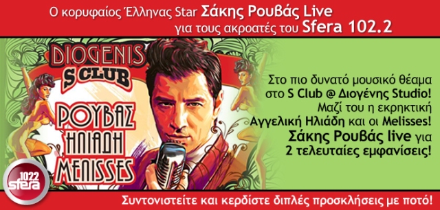 Ο κορυφαίος έλληνας star Σάκης Ρουβάς θα τραγουδήσει ζωντανά για τους ακροατές του Sfera 102.2 στο πιο δυνατό μουσικό θέαμα στο S Club @ Διογένης Studio!