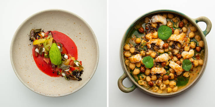 Οι προτάσεις στα ορεκτικά συνεχίζονται με το «Καλαμάρι Σχάρας, με πουρέ μαϊντανόριζας, μπιζέλι, chutney chorizo, γάλα καρύδας και κόλιανδρο», αλλά και με το πολύ διαφορετικό «Σαλάχι με Νιόκι, από μάγουλα από σαλάχι», ενώ στον κατάλογο υπάρχει πάντα η «Ρεβυθάδα με μοσχαρίσιο μεδούλι και καραβίδες».