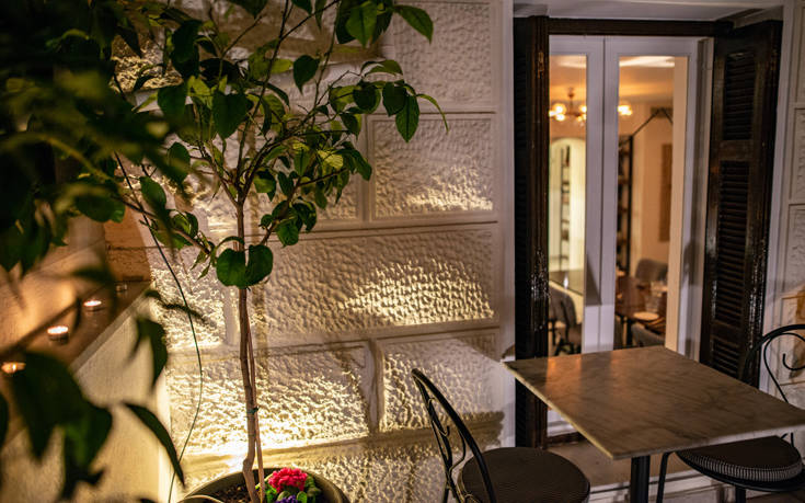 Ήδη έχει ανοίξει η μικρή cozy βεράντα του εστιατορίου, που φιλοξενεί τραπέζια από λευκό μάρμαρο, ενώ είναι στολισμένη με πολύ πράσινο και λουλούδια.