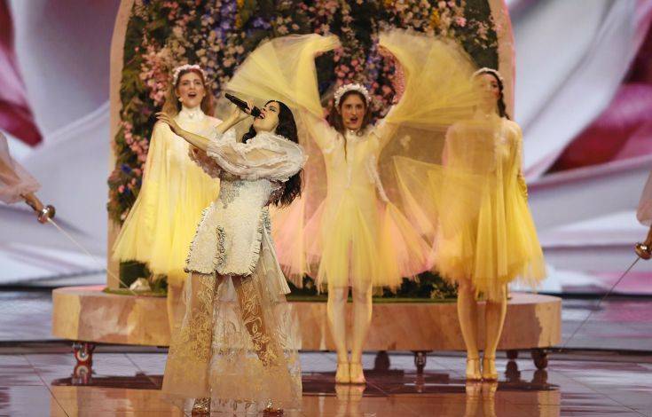 Το σκηνικό εντυπωσιακό. Φορώντας ένα κατάλευκο φόρεμα έκανε την πιο καλαίσθητη και υψηλού επιπέδου εμφάνιση. Το φόντο της ήταν σε αποχρώσεις του μωβ και του ροζ, ενώ αντανακλούσε και το κίτρινο από τα φόρεμα του μπαλέτου που την πλαισίωναν.