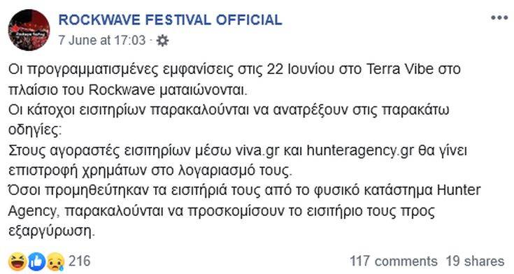 «Oι προγραμματισμένες εμφανίσεις στις 22 Ιουνίου στο Terra Vibe στο πλαίσιο του Rockwave ματαιώνονται.