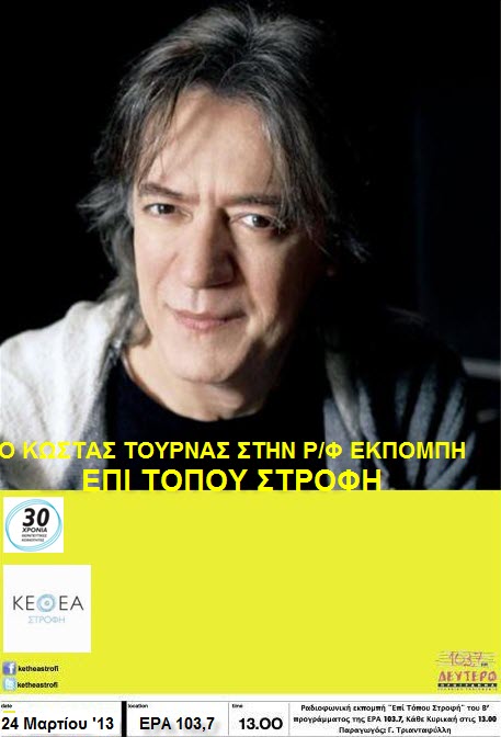 Ο Κώστας Τουρνάς είναι ένας καλλιτέχνης προφητικός, αιώνια έφηβος και πάντα δημιουργικός θα μας μιλήσει για τους θρυλικούς POLL για την αγαπημένη του ξύλινη κιθάρα, για την θριαμβευτική του πορεία στο τραγούδι, για τους πειρατές των ερτζιανών, για τον αυθορμητισμό που χάνεται όταν μεγαλώνουμε. Ο Κώστας Τουρνάς είναι ένας από τους πιο παλιούς και αγαπητούς φίλους της ΣΤΡΟΦΗΣ μια και γνωρίζει την Κοινότητα και το έργο της από τον πρώτο χρόνο λειτουργίας της πριν από 25 χρόνια .