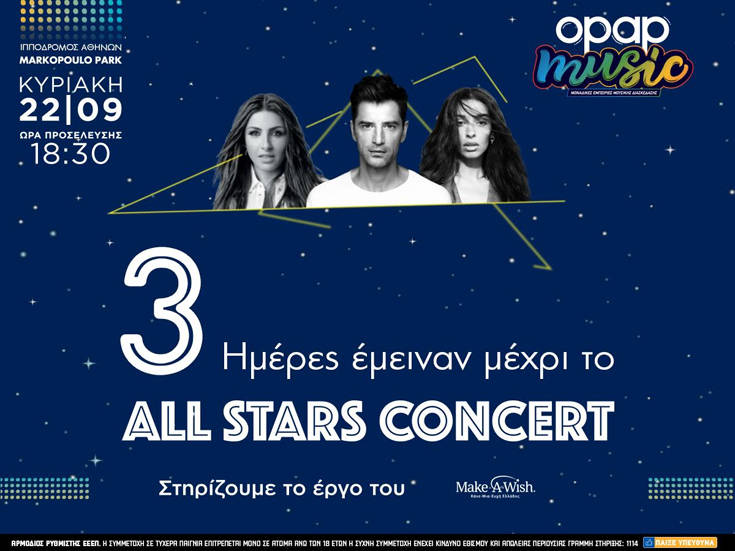Όλοι οι δρόμοι την ερχόμενη Κυριακή 22 Σεπτεμβρίου οδηγούν στον Ιππόδρομο Αθηνών, Markopoulo Park, όπου ο ΟΠΑΠ παρουσιάζει το μεγαλύτερο μουσικό event της χρονιάς. Σάκης Ρουβάς, Έλενα Παπαρίζου και Ελένη Φουρέιρα, μαζί για πρώτη φορά επί σκηνής, θα δώσουν τον ρυθμό στην πιο μελωδική και χορευτική συναυλία του φθινοπώρου. Τραγούδια που όλοι έχουμε αγαπήσει, νέα επιτυχίες, χορευτικά hit και μουσικές εκπλήξεις θα συνθέσουν ένα τρίωρο live, το οποίο θα ξεκινήσει λίγο πριν τις 20:00 με το μουσικό συγκρότημα Αlcatrash.