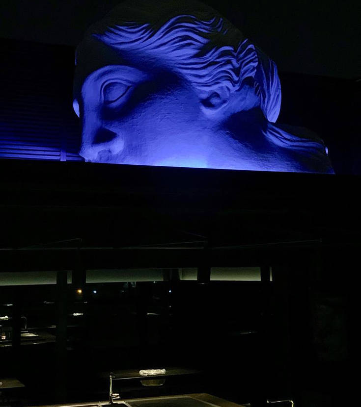 Η επιβλητική προτομή της θεάς Αθηνάς, του γλύπτη Βασίλη Σακή, που έχει τοποθετηθεί επάνω από το κεντρικό Bar, είναι σε επαφή με τον Παρθενώνα.