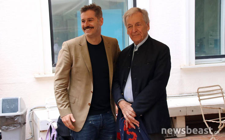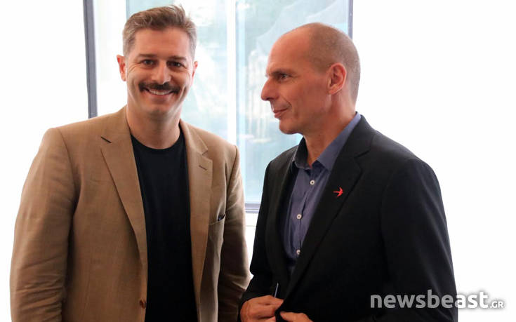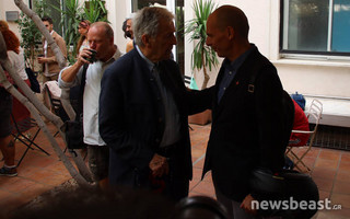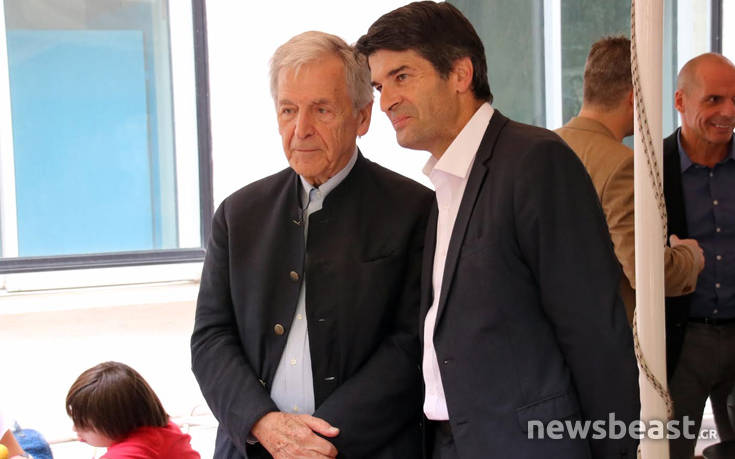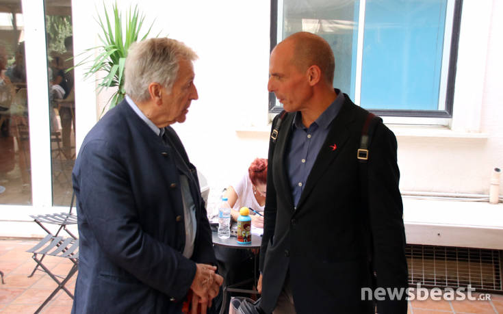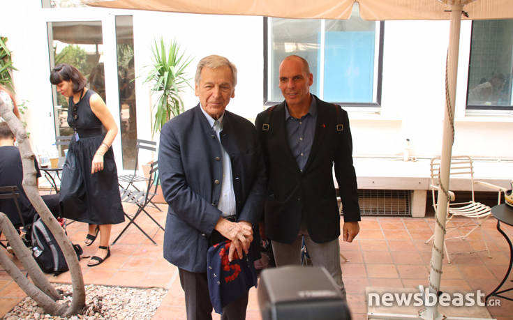 Κώστας Γαβράς, Γιάνης Βαρουφάκης και Αλέξανδρος Μπουρδούμης είναι ήδη εκεί, χαμογελαστοί και ιδιαίτερα «θερμοί» μεταξύ τους.