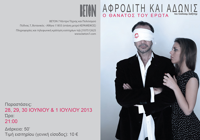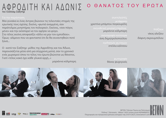 Ο -κατά τον Σαίξπηρ- μύθος της Αφροδίτης και του Άδωνι, παρουσιάζεται μέσα από μια σύγχρονη ματιά, σαν το χρονικό ενός χωρισμού όπου το τέλος του έρωτα βιώνεται ως θάνατος. Γιατί «τέλος κακό έχει κάθε γλυκιά αρχή…»