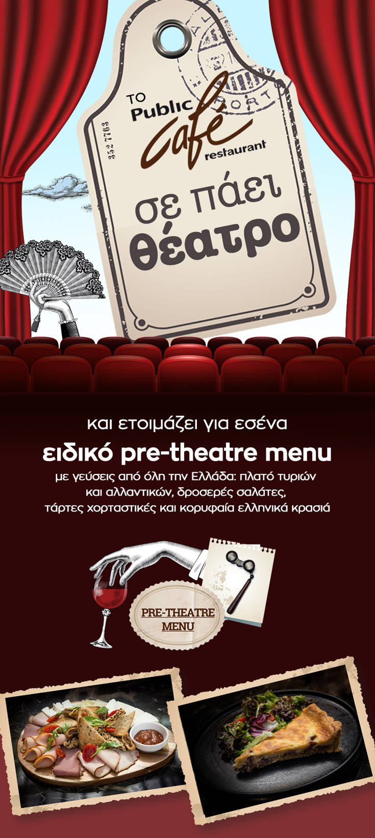 Το Public Cafe Restaurant ανοίγει τη θεατρική σαιζόν της πόλης, καλώντας τους φίλους του θεάτρου να ζήσουν μια ξεχωριστή γευστική εμπειρία, να γνωρίσουν από κοντά τους αγαπημένους τους πρωταγωνιστές και να κερδίσουν εισιτήρια σε πρόβες και πρεμιέρες!