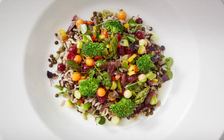 Από τις προτάσεις των ορεκτικών αξίζει κανείς να επιλέξει ένα αυθεντικά ελληνικό πιάτο όπως το βιολογικό φακόρυζο με πέρλες λαχανικών, μπρόκολο, ελιές και φρέσκα βότανα εποχής.