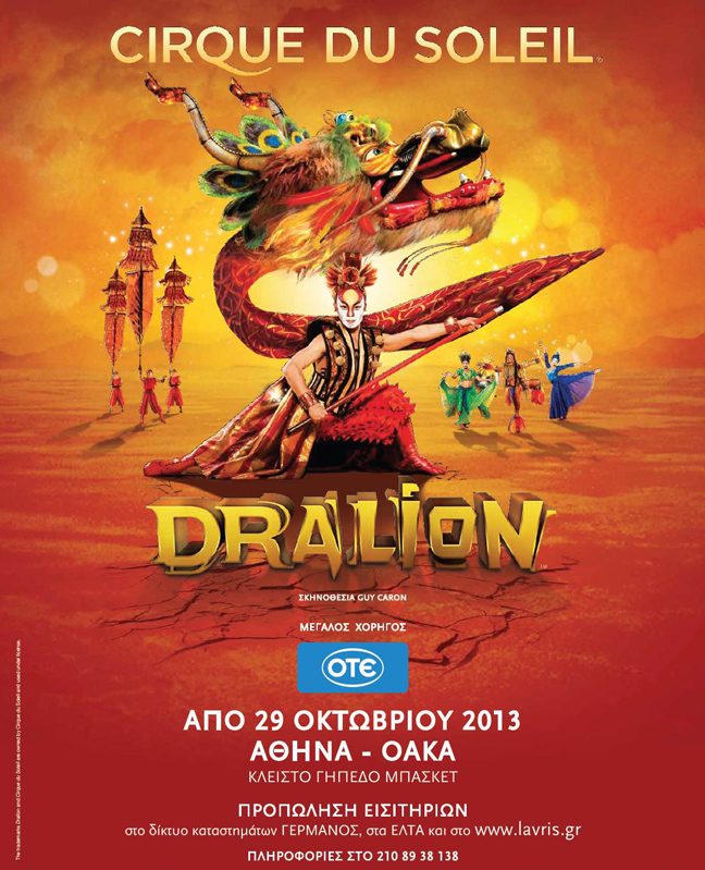 Το νέο ραντεβού του Cirque du Soleil με το ελληνικό κοινό το 2013, έχει οριστεί για την περίοδο 29 Οκτωβρίου έως και 3 Νοεμβρίου στο κλειστό γήπεδο Μπάσκετ στο ΟΑΚΑ, με διοργανώτρια και φέτος την εταιρεία ΛΑΒΡΥΣ. Mε την παράσταση Dralion, που φέτος κλείνει τα 14 της χρόνια, το Cirque du Soleil παρουσιάζει ακόμη ένα εντυπωσιακό υπερθέαμα που αψηφά τους νόμους της βαρύτητας. Αντλώντας έμπνευση από την ανατολίτικη φιλοσοφία και τη συνεχή αναζήτησή της για ισορροπία μεταξύ Ανθρώπου και Φύσης, το Dralion αποτελεί μία φαντασμαγορική παράσταση που θα μαγέψει μικρούς και μεγάλους.