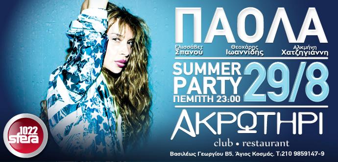 O Sfera 102,2 και η Πάολα σας υποδέχονται στην Αθήνα μετά τις καλοκαιρινές διακοπές με ένα μοναδικό live party! Απόψε Πέμπτη 29 Αυγούστου, στις 11 το βράδυ, στο Ακρωτήρι Club – Άγιος Κοσμάς!