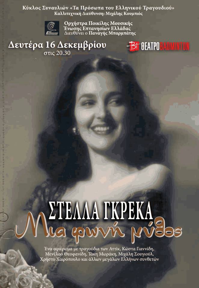 Η σειρά συναυλιών του θεάτρου Badminton «Τα Πρόσωπα του Ελληνικού Τραγουδιού» σε καλλιτεχνική διεύθυνση του συνθέτη Μιχάλη Κουμπιού προτείνει ένα μεγάλο αφιέρωμα στην Στέλλα Γκρέκα, τη Δευτέρα 16 Δεκεμβρίου 2013 στις 8:30μμ.