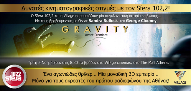 Ο Sfera 102,2 και η Village παρουσιάζουν μία συγκλονιστική ιστορία επιβίωσης, το Gravity με τους βραβευμένους με Oscar Sandra Bullock και George Clooney.